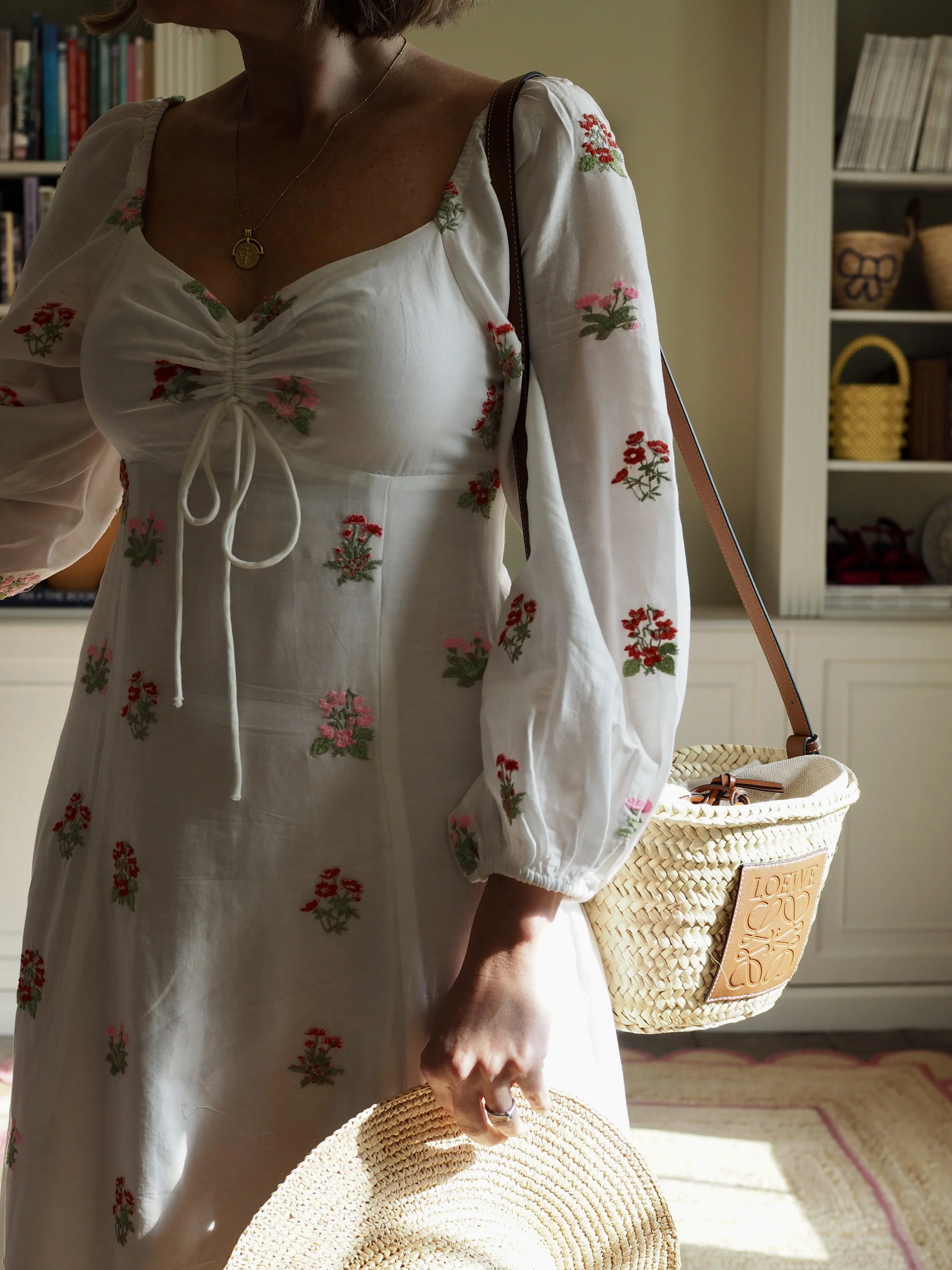 It’s in a cotton linen fabric, has a deep V at the back (whilst still covering your bra) and embroidery on the big puff sleeves and hems. Perfect for anyone who wants to cover up their arms a bit! I’m wearing my usual size 12 here but do size down if in between sizes or you prefer it more fitted.