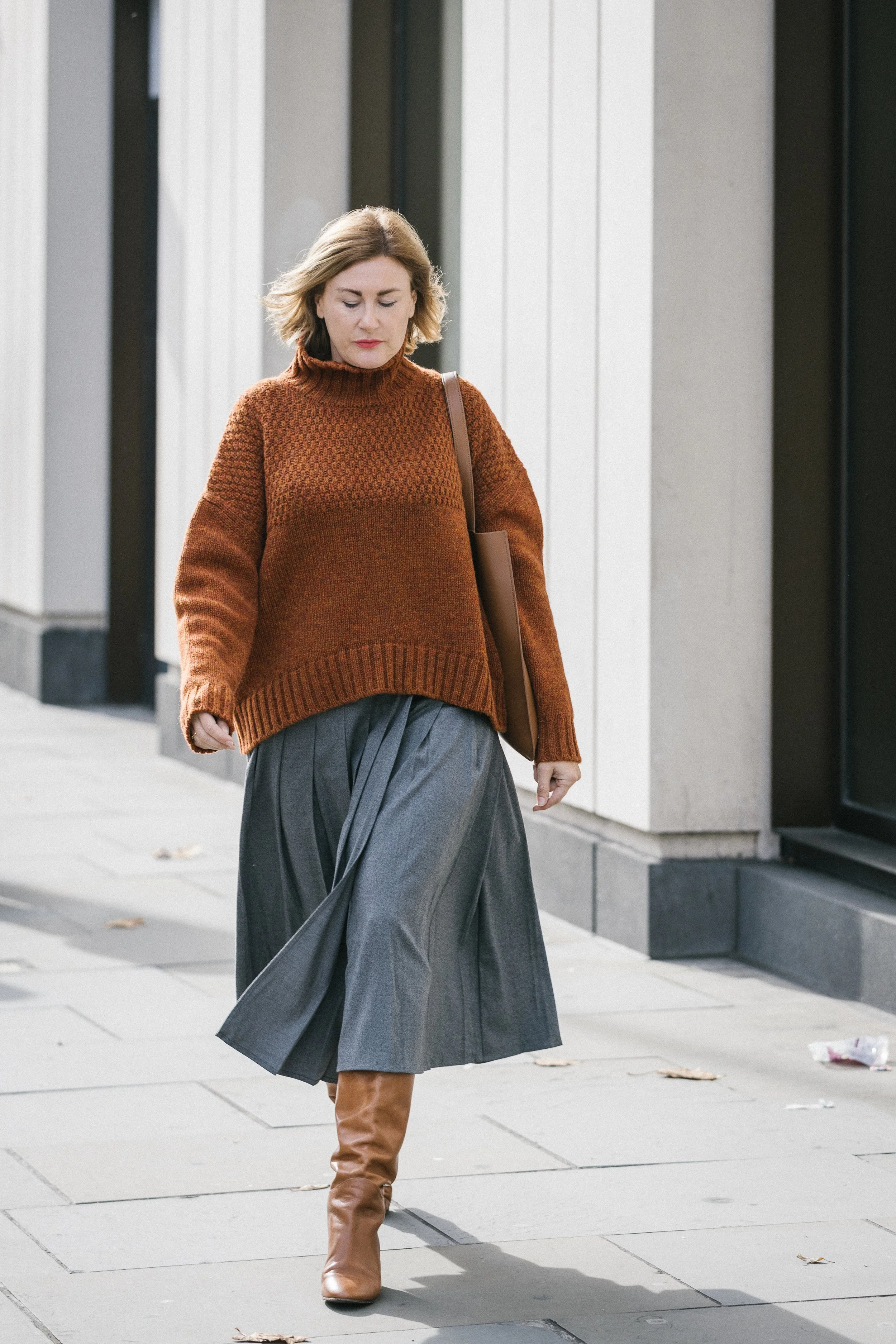 This grey pleated Midi Skirt by Albaray has been on my wishlist for a while now and it doesn’t disappoint! The side buckle styling on it gives a nice nod to the kilt trend. I styled it with a Charl Knits Craske Shetland Wool jumper in the colour that truly sings AUTUMN! The leather blazer is an easy throw on to help elevate any outfit. This one by Albaray is classic, super soft with an easy relaxed fit that I look for in a blazer.
