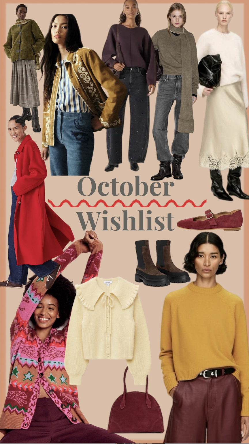Writing this as the leaves drop and the rain falls as Storm Amy sweeps the country this weekend! It definitely feels like knitwear season is here and I am reaching for all the layers (and rain coats!). Burgundy, red, checks, argyles, olive and mustard tones are calling me and I have found some goodies in this months wishlist. I already purchased this Scarf Jumper from my list which is making me very happy!